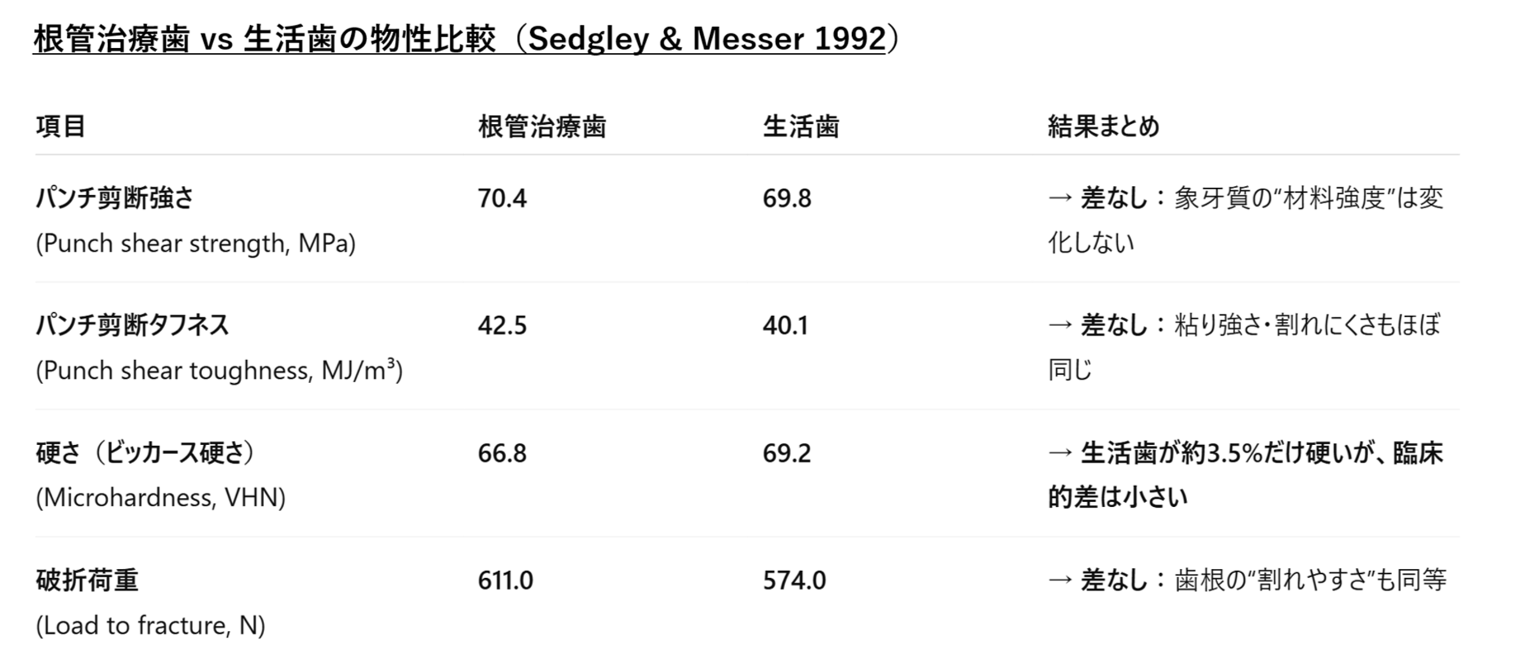 Sedgley & Messer らの研究では、根管治療歯と生活歯の強度を比較しました。(参考文献②)