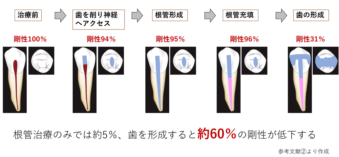 Reeh and Messerの研究では、根管治療を行ったとしても歯の剛性はほとんど低下せずに、その後の歯の形成により歯の剛性が大きく低下することを明らかにしました。(参考文献②)